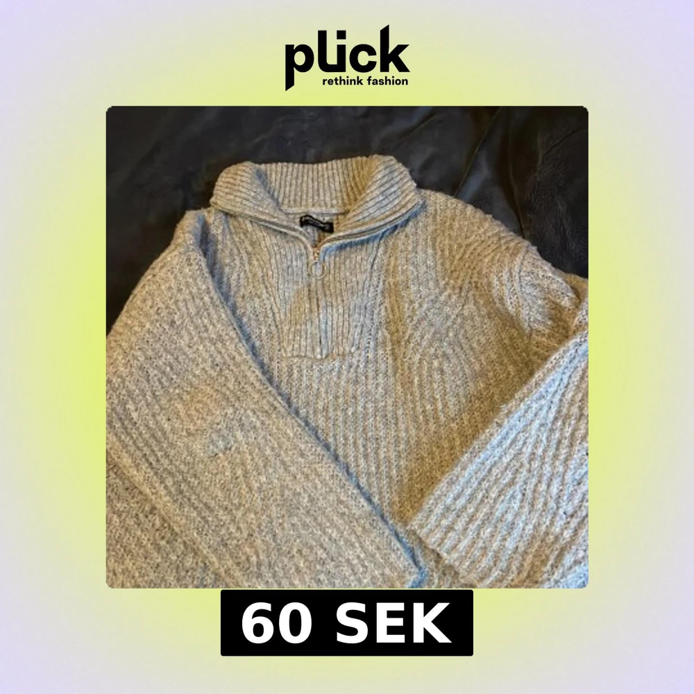 Säljer en mysig grå stickad tröja med dragkedja och hög krage. Perfekt för kyliga dagar med sin ribbade design och långa ärmar. En stilren och bekväm tröja för alla tillfällen.