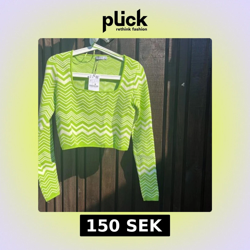 Säljer en grön och vit stickad tröja från Stradivarius med coolt zigzag-mönster. Tröjan är croppad, har lång ärm och fyrkantig ringning. Perfekt för dig som vill sticka ut med färg och mönster i din outfit.