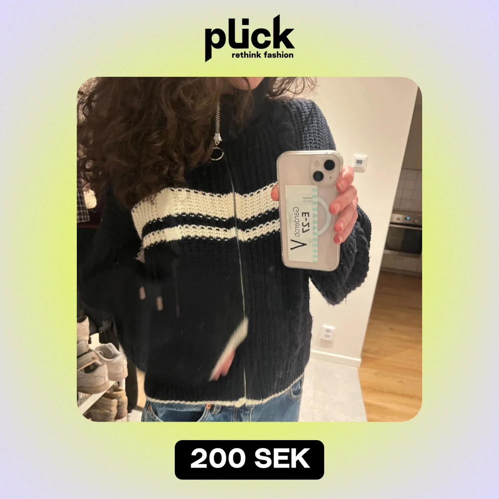 Säljer en mysig svart stickad kofta med dragkedja och vita ränder över bröstet. Den har en hög krage och är perfekt för kyliga dagar. Koftan är i bra skick är knappt använd
