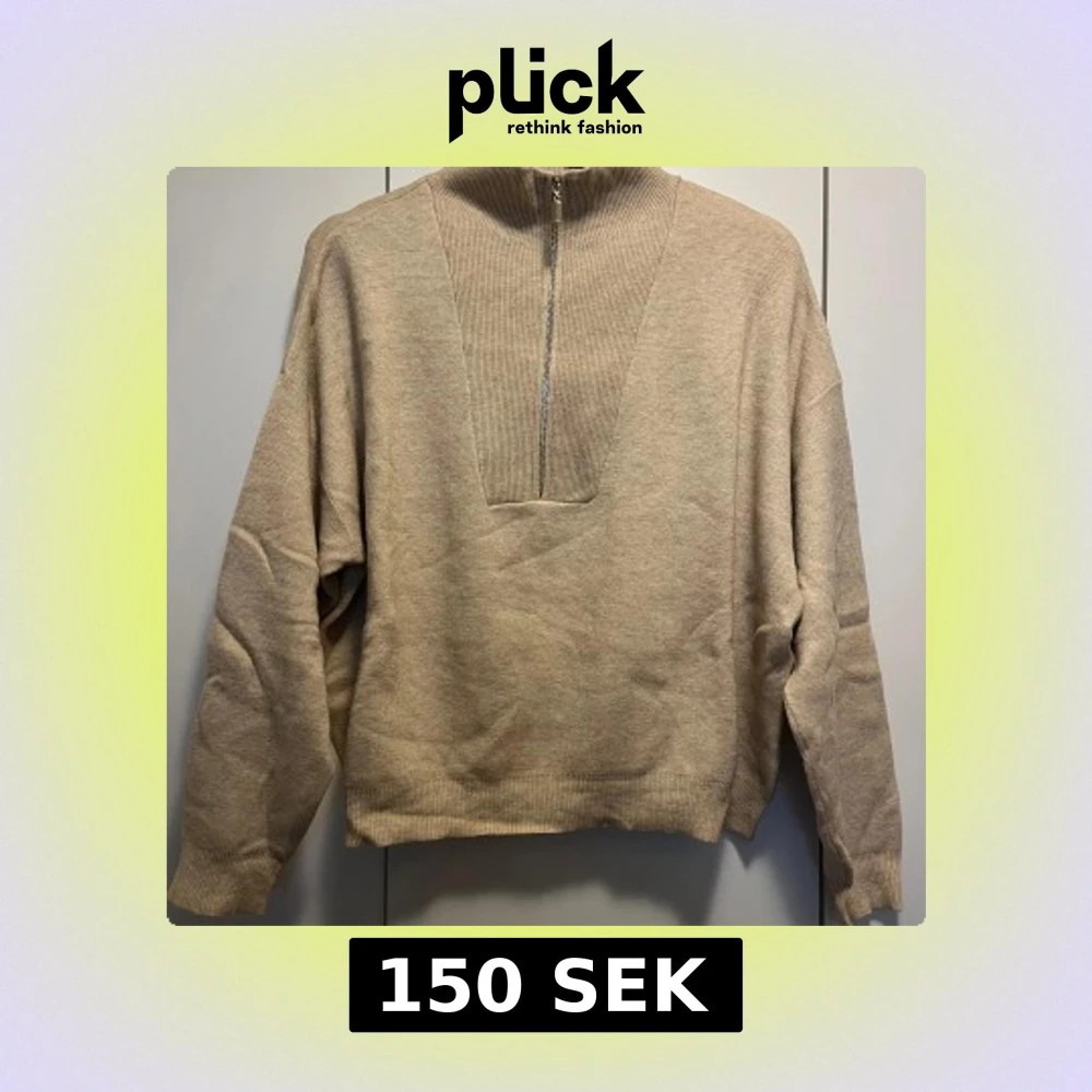 Säljer en beige stickad tröja från Stradivarius med dragkedja framtill. Tröjan har en hög krage och långa ärmar.