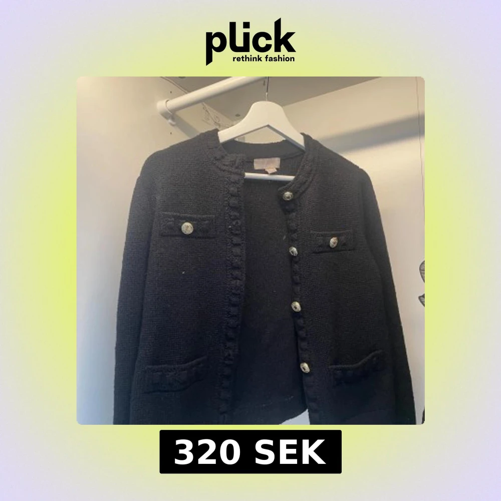 Svart stickad cardigan jacka från H&M i storlek XS. Jackan har dekorativa silvriga knappar framtill och på fickorna, samt en snygg kantdetalj längs öppningen. Perfekt för dig som gillar klassisk och stilren look med en twist.