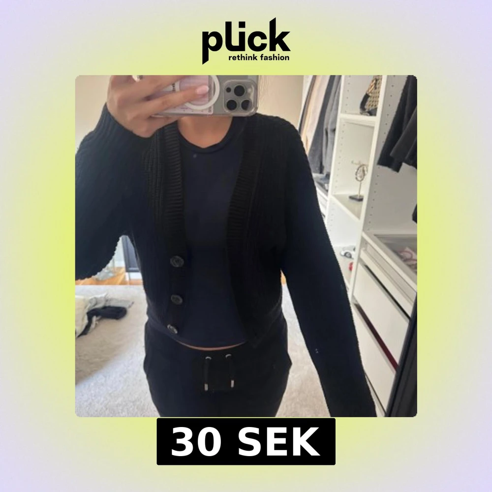 Säljer en svart, croppad kofta med grovstickad struktur och tre stora knappar framtill.