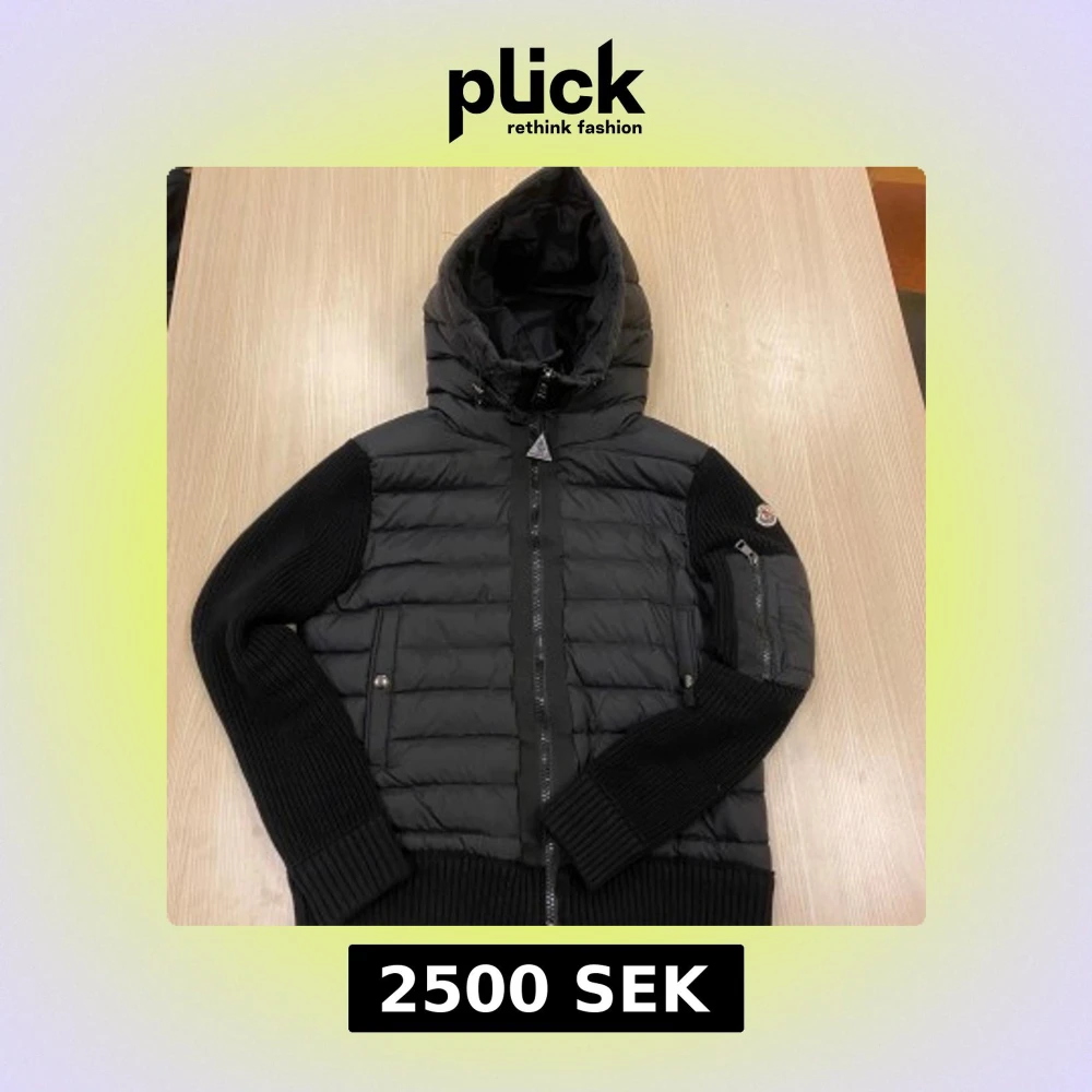 Snygg svart dunjacka från Moncler med stickade ärmar och huva. Jackan har dragkedja framtill och en ficka med dragkedja på ärmen. Perfekt för kyliga dagar med stil.