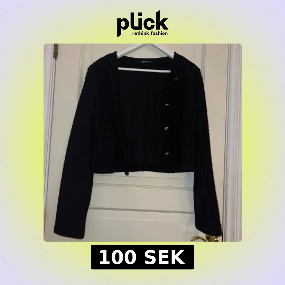 Säljer en svart, croppad kofta från Gina Tricot med långa ärmar och snygga knappar framtill. Koftan har en mjuk, stickad känsla och passar perfekt till lager-på-lager-stil. Enkel att matcha med både jeans och kjol.