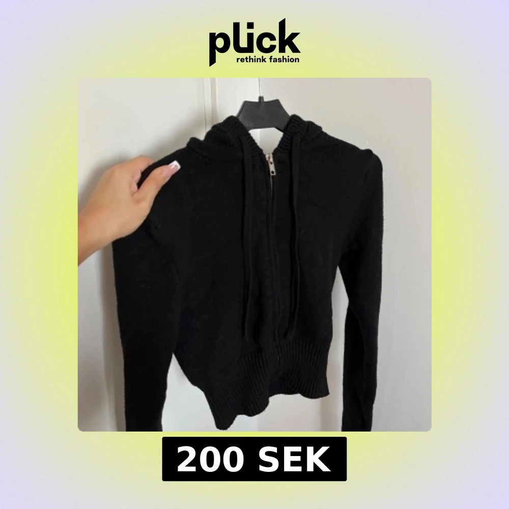 Svart stickad kofta med dragkedja framtill och snörning i huvan. Tröjan har ribbade muddar och midja, samt långa ärmar. Knappt använd från Nelly! Perfekt för dig som gillar en enkel och stilren look. Storlek S.