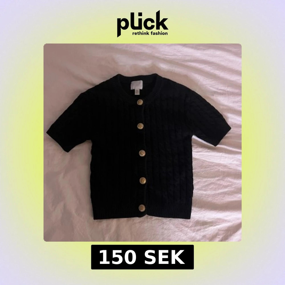 Kortärmad svart kofta från H&M med snygga guldknappar framtill. Tröjan är stickad med ett diskret kabelmönster och har ribbade kanter vid hals, ärmslut och nederkant. Perfekt för lager-på-lager och en clean look.