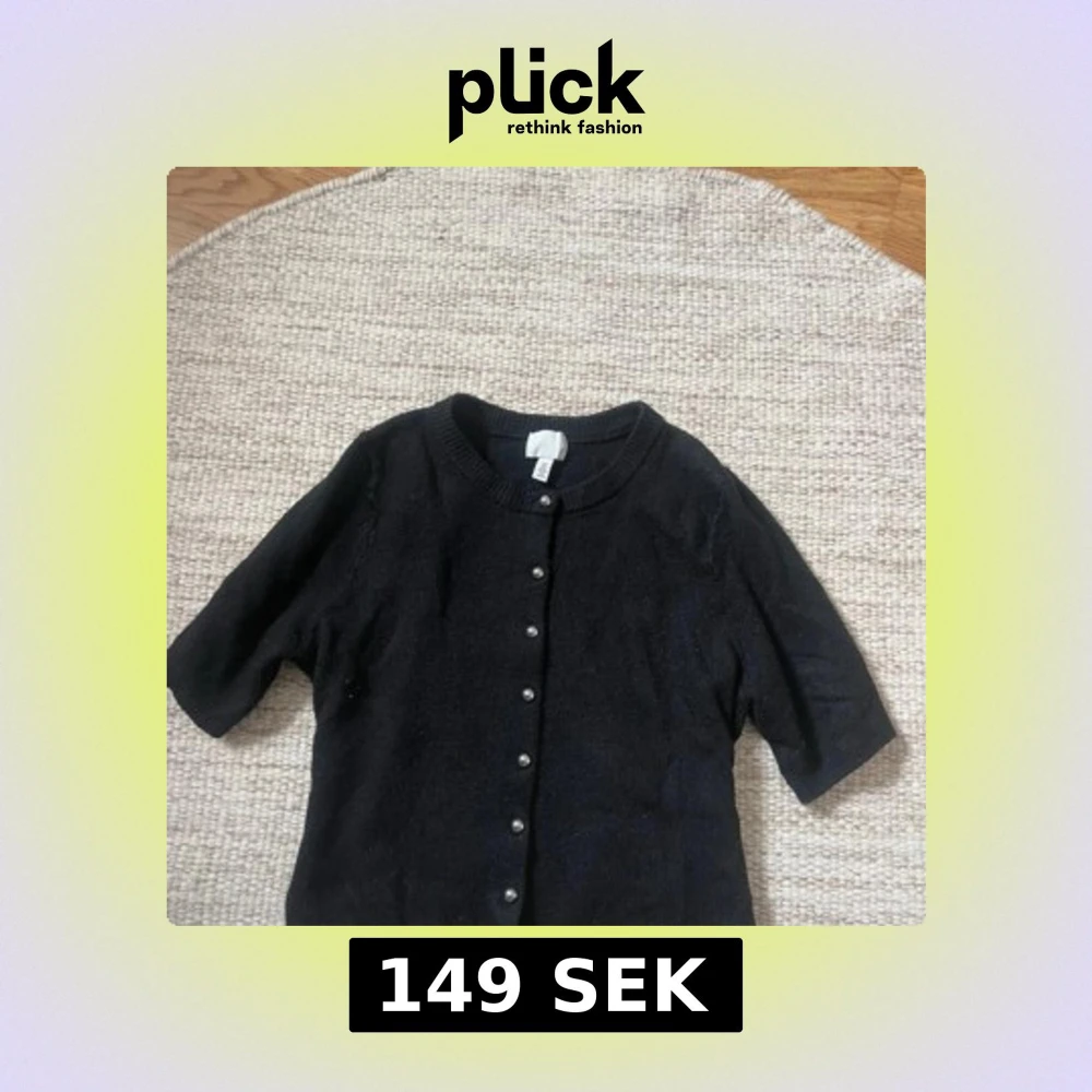 Kortärmad svart kofta från H&M med rund halsringning och snygga silvriga pärlknappar framtill. Stickad i mjukt material, perfekt att slänga över en topp eller klänning. Enkel och stilren design som funkar till många outfits.