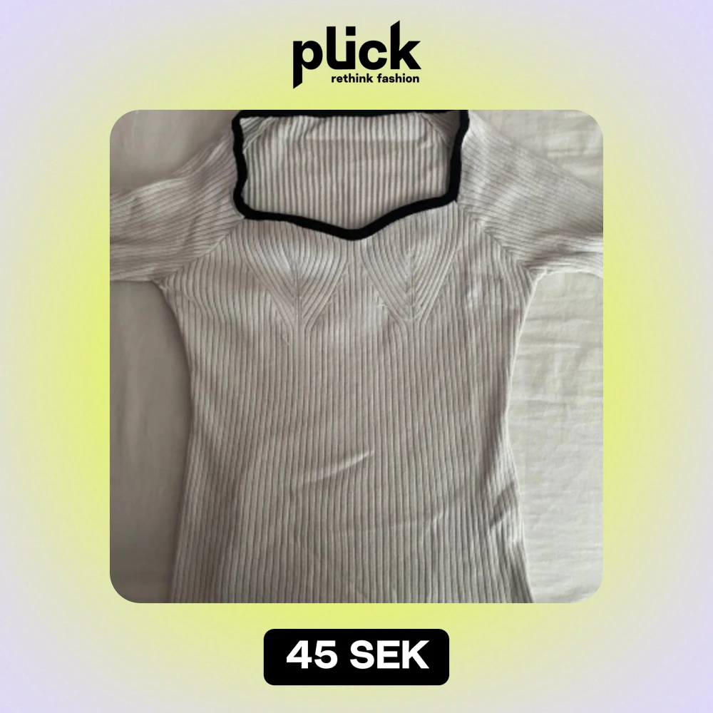 En vit ribbad tröja med en svart kant runt halsen. Tröjan har långa ärmar och en unik halsringning.