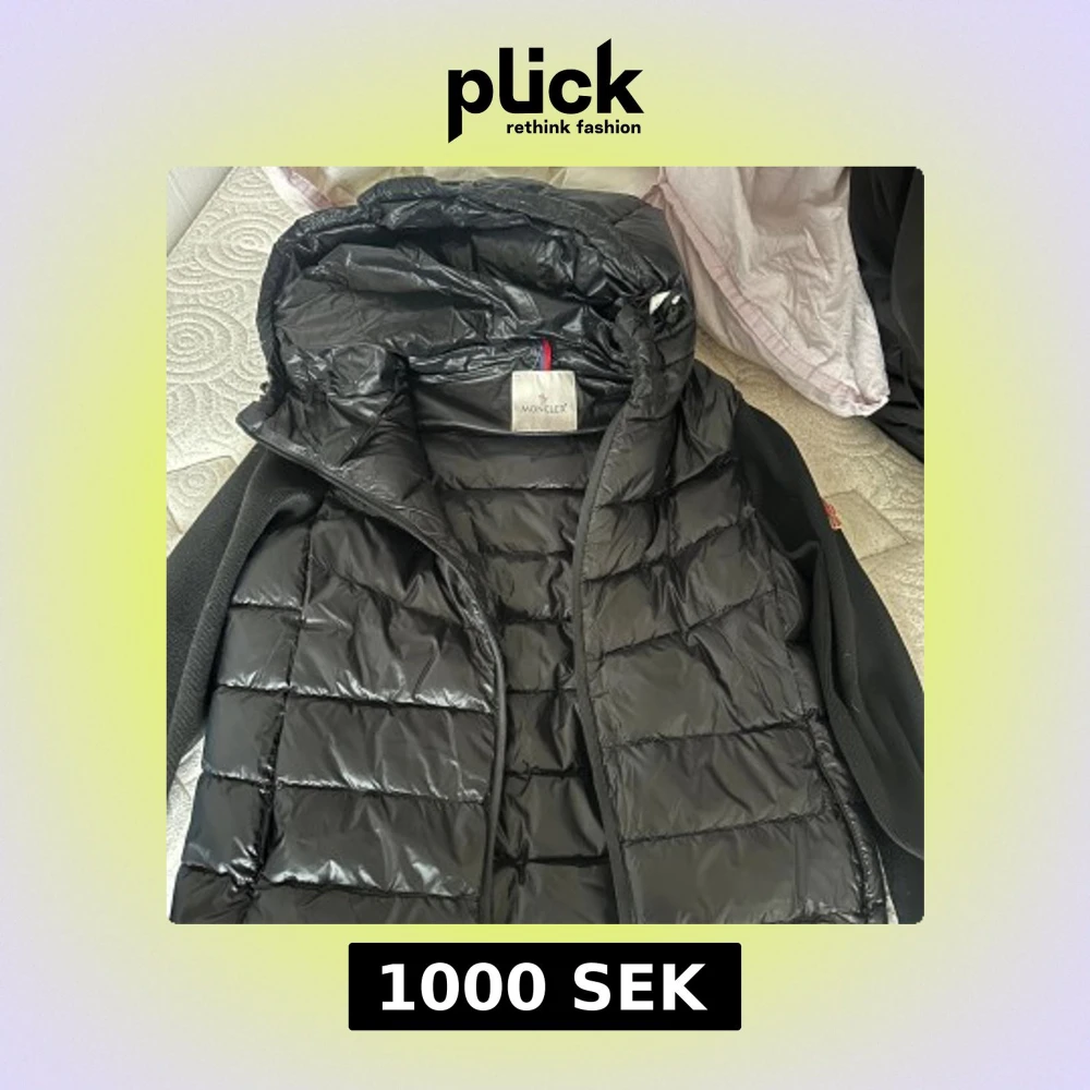Svart pufferjacka från Moncler med glansig yta och huva. Jackan har quiltad design, dragkedja framtill och svarta stickade ärmar med Moncler-logga på vänster arm. Perfekt för dig som gillar stilren och sportig look.
