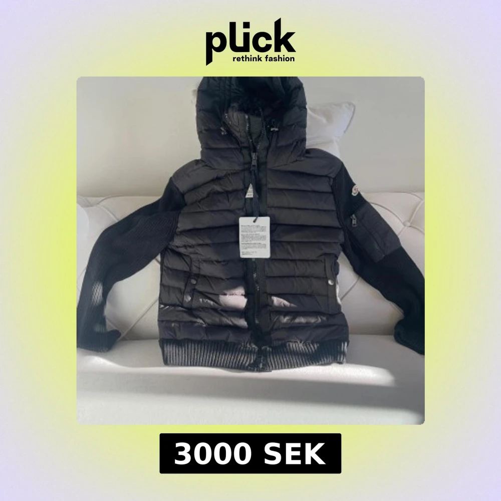 Snygg svart dunjacka från Moncler med stickade ärmar och huva. Jackan har dragkedja framtill, ribbade muddar och Moncler-logga på ärmen. Perfekt för kalla dagar och ger en riktigt clean look. Pris kan diskuteras vid snabb affär