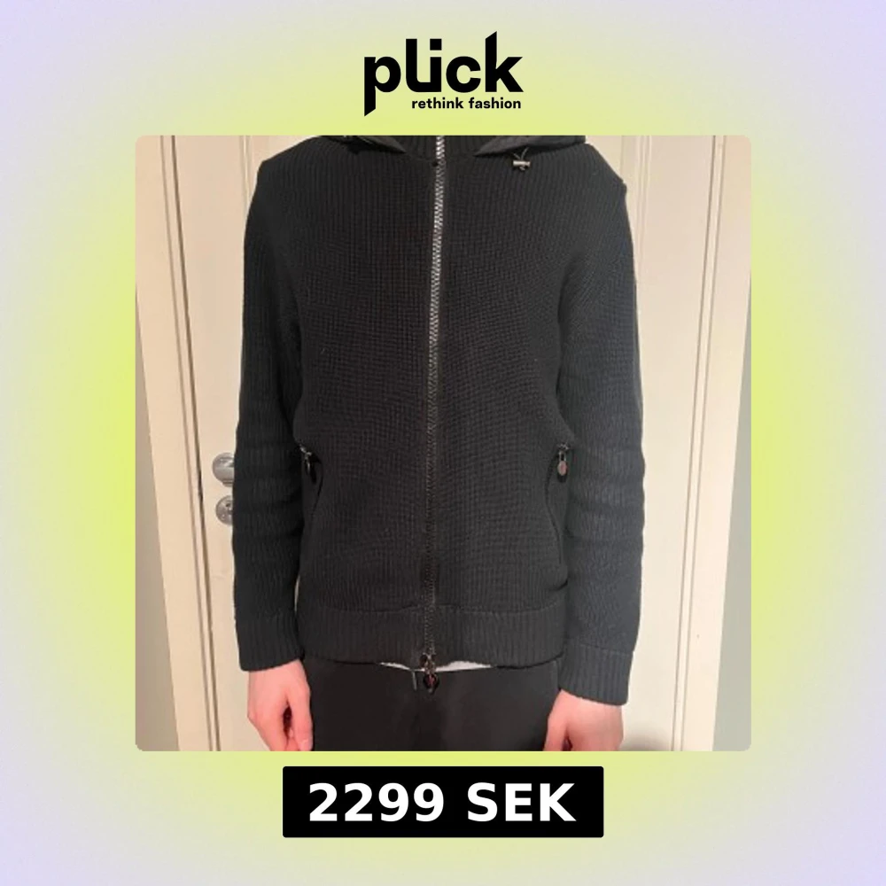 Svart pufferjacka från Moncler med stickade ärmar och quiltad rygg. Jackan har huva med snörning, två sidofickor med dragkedja och Moncler-logga på vänster ärm. Snygg, stilren och perfekt för kyliga dagar.