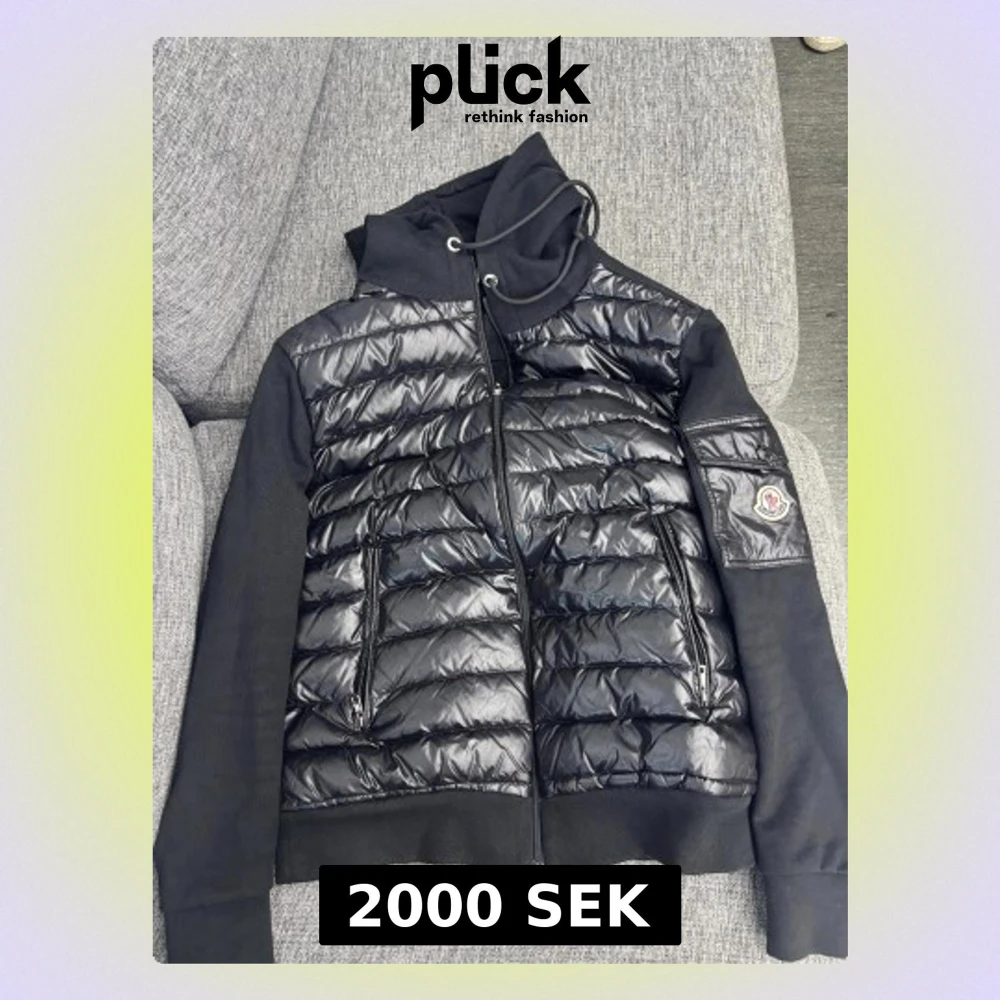 Svart pufferjacka från Moncler med glansig yta och quiltad front. Jackan har huva med snörning, två dragkedjeförsedda fickor och Moncler-logga på ärmen. Materialmix med polyester och stickade partier på ärmarna. Perfekt för dig som gillar streetwear och exklusiva märken. Nfc på äkta kvitto kan hittas, den är i nyskick o knappt använd