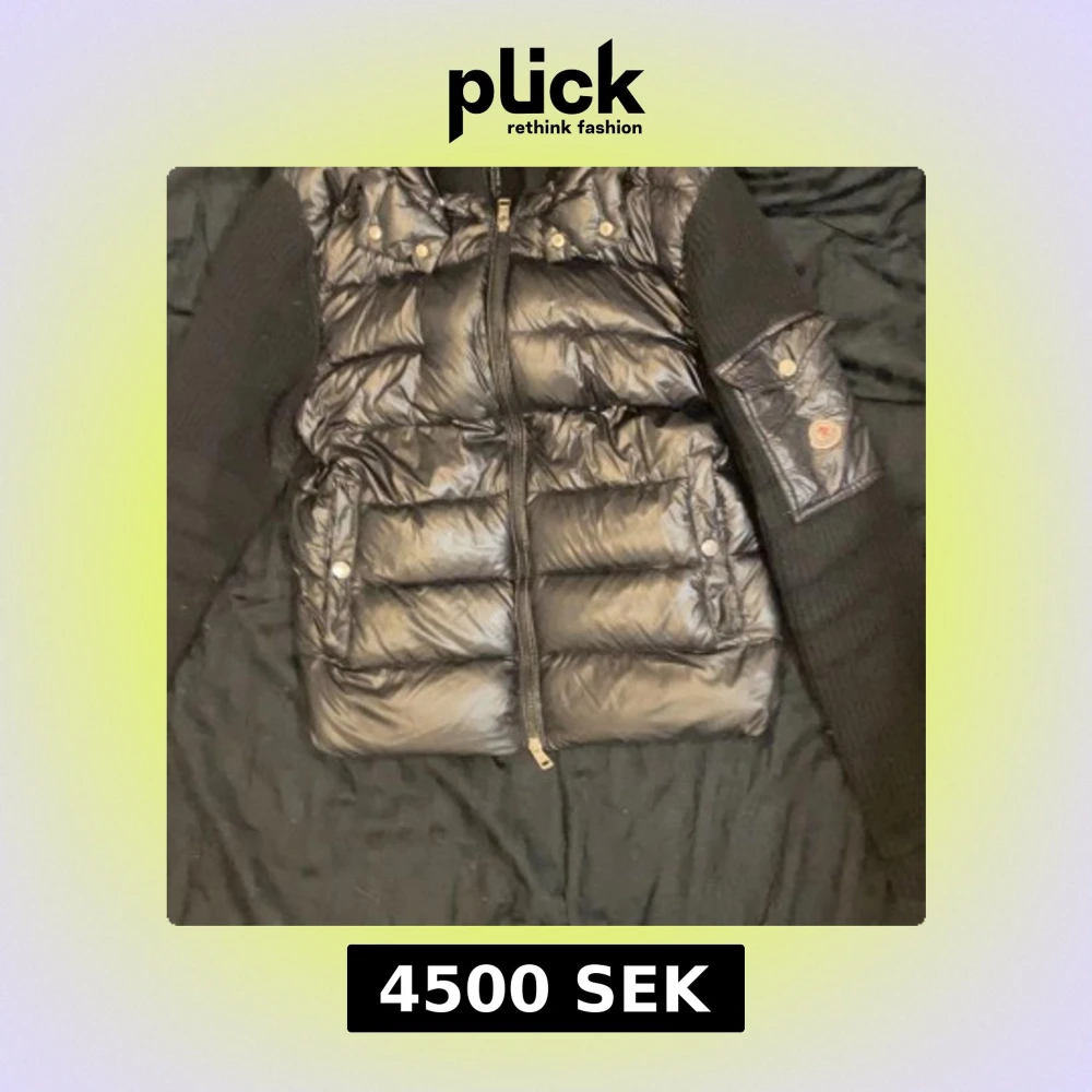 Säljer en svart pufferjacka från Moncler med glansig yta och stickade ärmar. Jackan har dragkedja framtill, tryckknappar på fickorna och Moncler-logga på ärmen. Perfekt för dig som vill ha en snygg och varm jacka med coola detaljer.