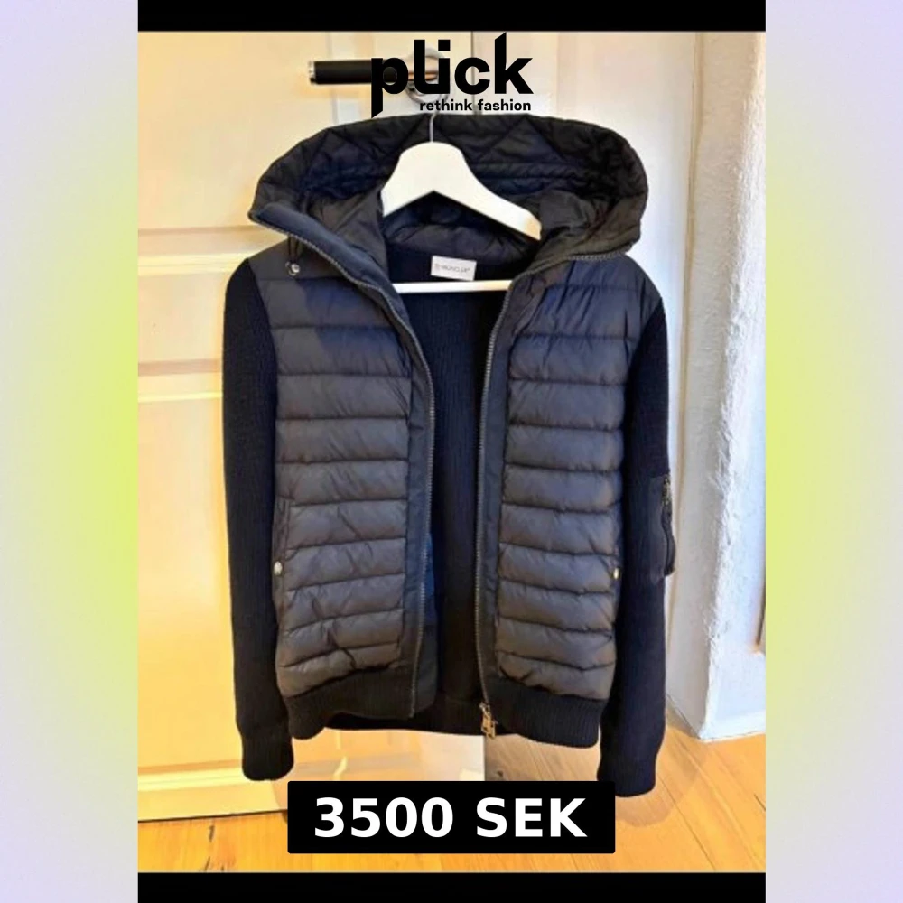 Snygg svart pufferjacka från Moncler med stickade ärmar och huva. Jackan har quiltad front och rygg, dragkedja framtill och en ficka med dragkedja på ärmen. Perfekt för kyliga dagar och riktigt stilren look.