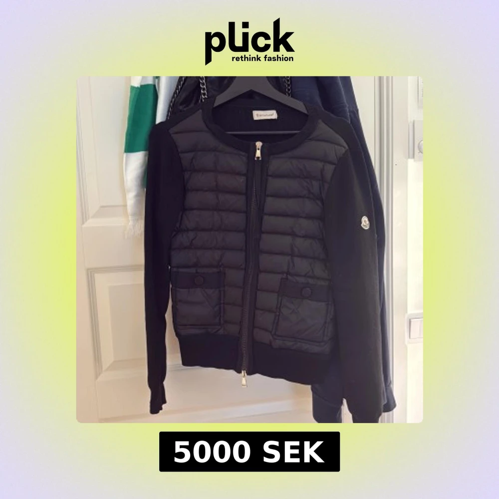 Svart pufferjacka från Moncler med quiltad front och två fickor med knappar. Jackan har långärmade stickade ärmar och Moncler-logga på ena ärmen. Dragkedja framtill och ribbade muddar ger en clean och sportig look.