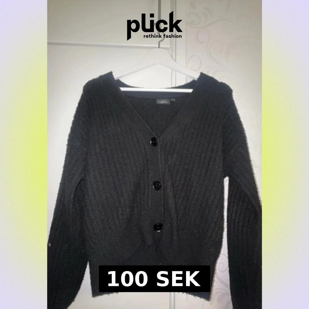 Säljer en svart, ribbad kofta från KappAhl i storlek XS. Koftan har v-ringning, tre stora svarta knappar framtill och är stickad med långärmad passform. Perfekt för dig som gillar en enkel men snygg look med lite croppad känsla. Den är helt ren och precis som ny. Köpte den för några månader sen och har ej använt den.