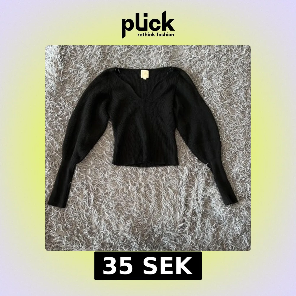 Svart stickad tröja från H&M i storlek XS med v-ringning och långa, ballongformade ärmar. Tröjan är ribbad och har en croppad passform som sitter snyggt på kroppen. Materialmix med akryl, polyamid, ull och lite elastan för stretch.