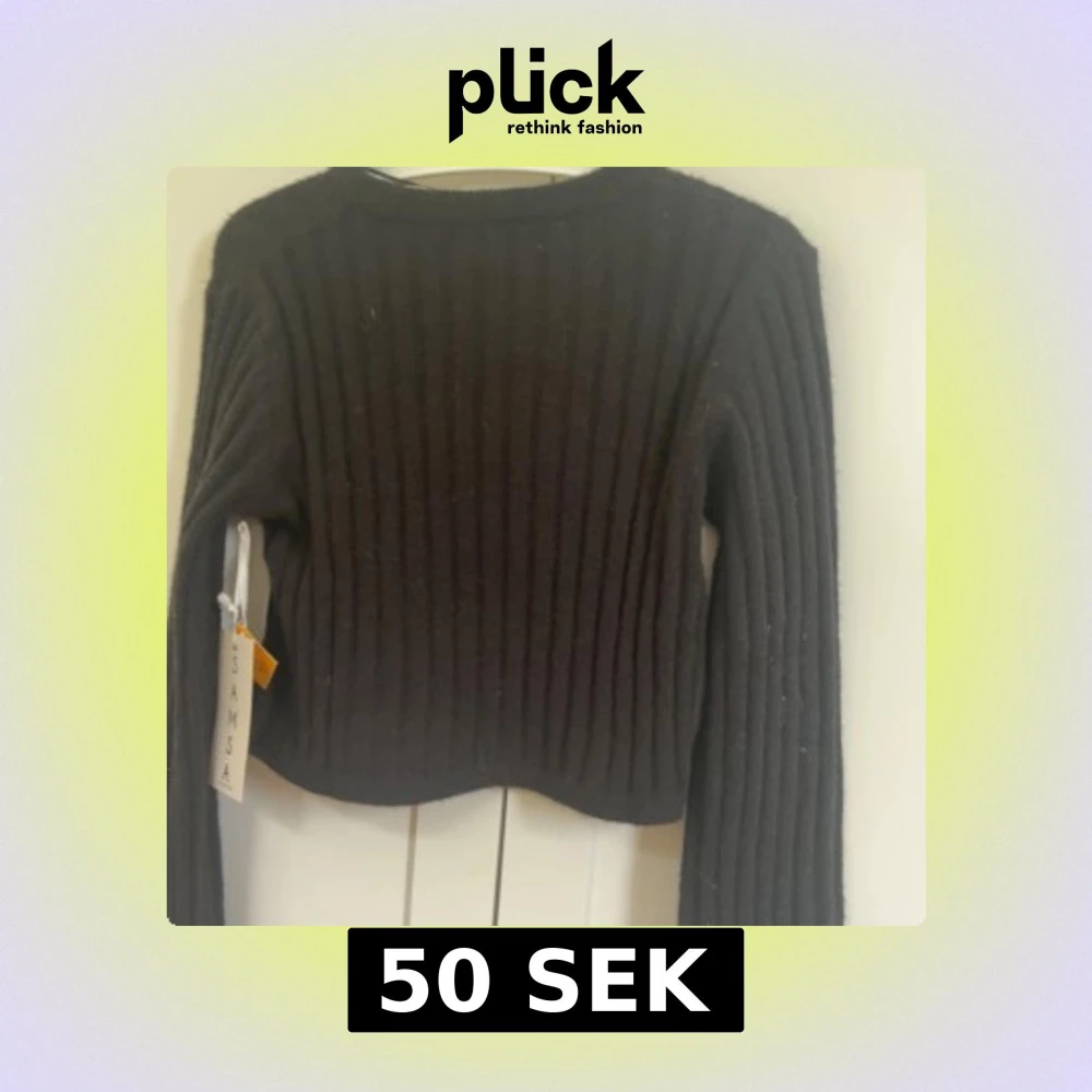 Säljer en svart ribbad stickad tröja från Samsa. Tröjan har lång ärm, croppad passform och är tillverkad i ett mjukt stickat material. Perfekt för lager-på-lager och funkar till många olika stilar.