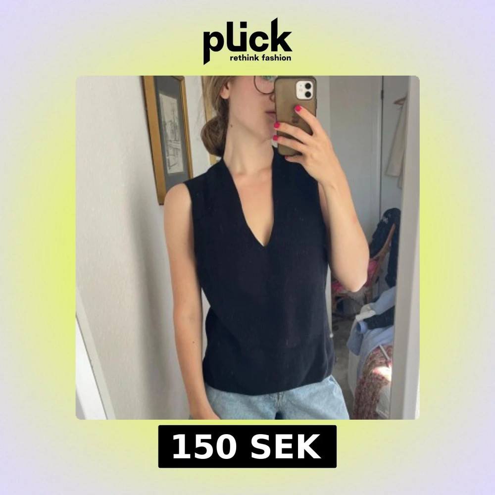Svart stickad topp med djup v-ringning och ärmlös design. Modellen är rak och har små slitsar i sidorna för en chill look. Perfekt att styla med jeans eller shorts för en enkel men snygg outfit.