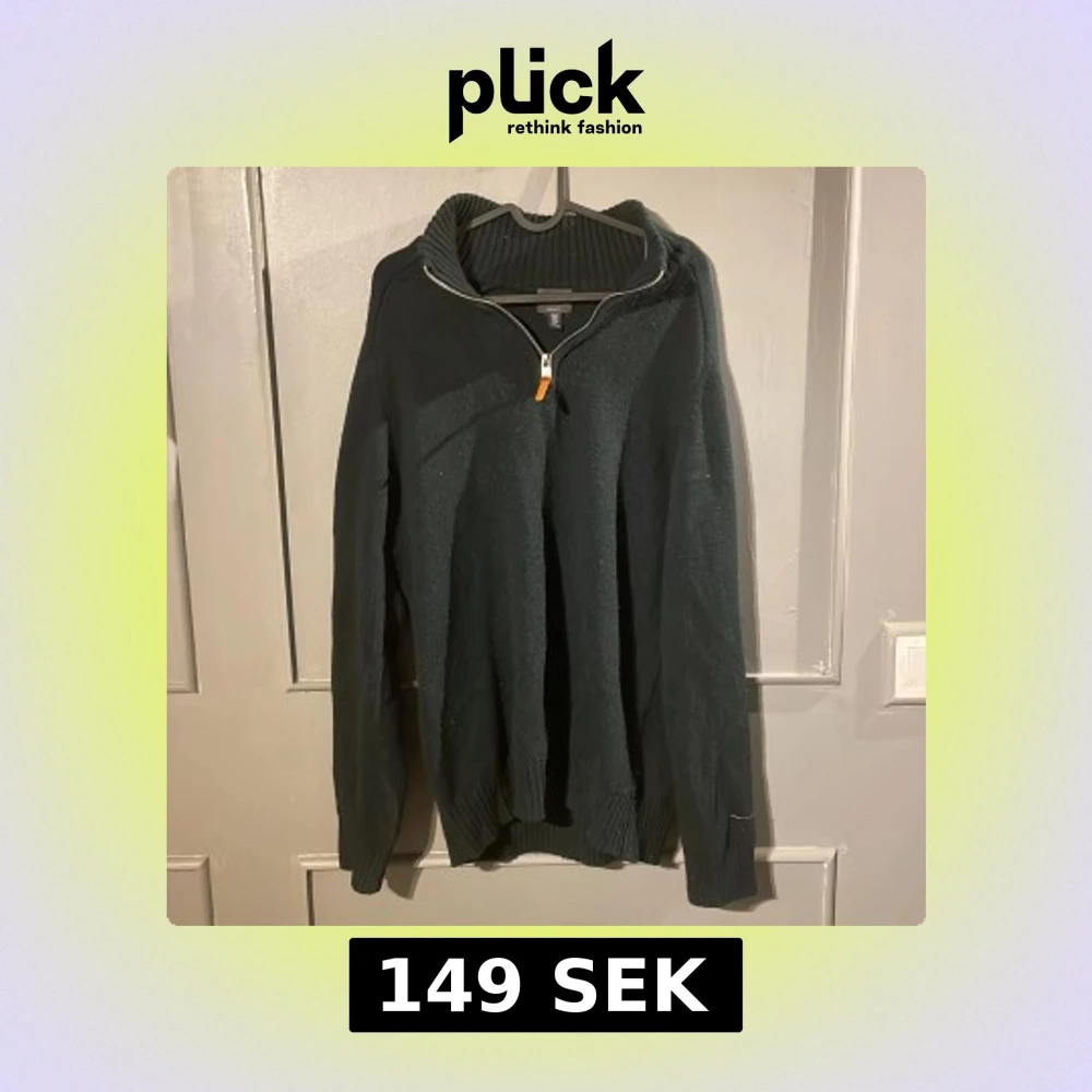 Mysig svart stickad tröja från H&M med ribbad krage och half zip-dragkedja. Regular fit och långärmad modell, perfekt för kyliga dagar. Enkel och stilren design som funkar till det mesta.