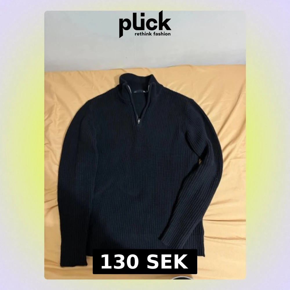 Svart ribbstickad tröja från 157 med hög krage och half zip-dragkedja. Tröjan har lång ärm och är gjord i ett grovt stickat material som känns både stilrent och chill. Perfekt för lager-på-lager under kyliga dagar. Ganska nytt skick storlek M.