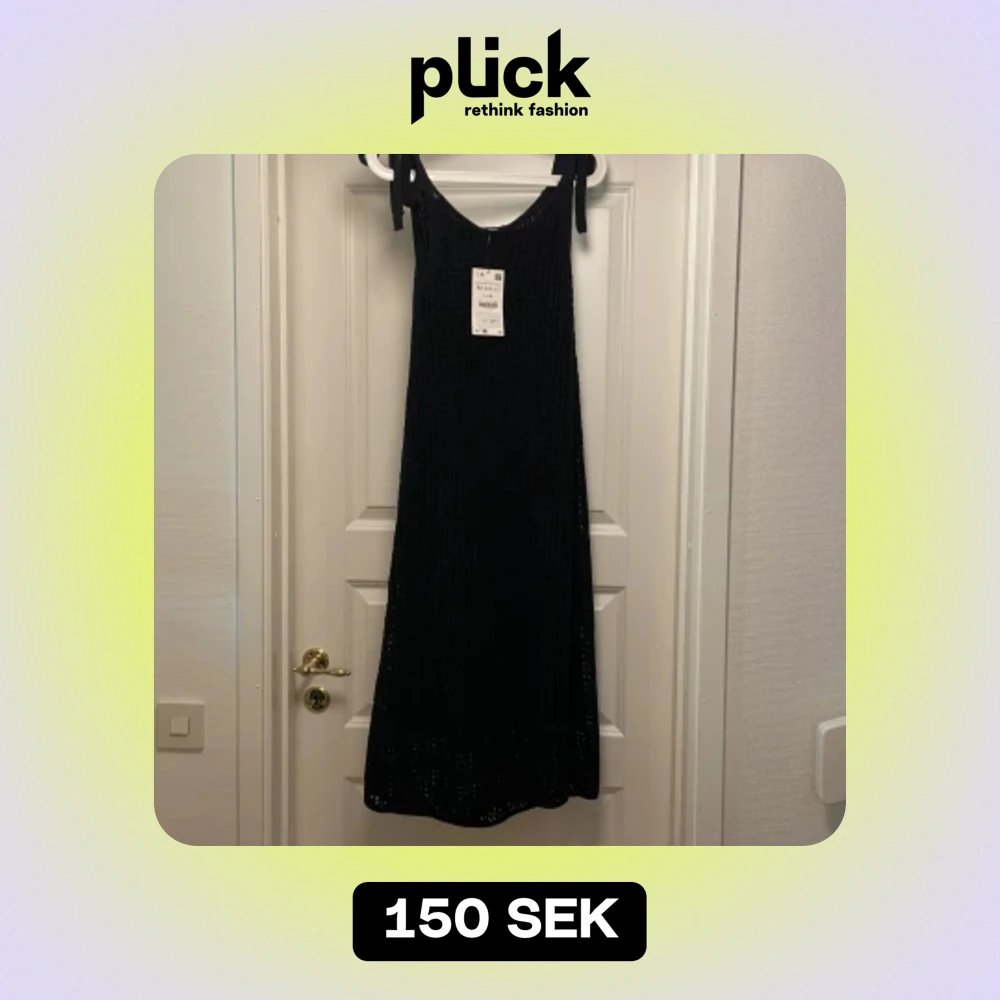 Svart stickad klänning med knutna axelband Aldrig använd. Något liten i storlek jag har normalt S i kläder