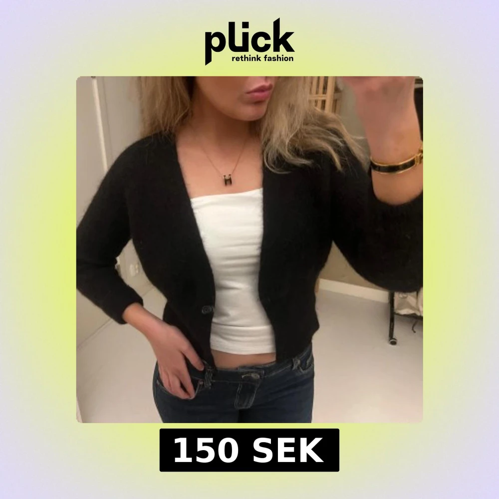 Säljer en svart, croppad stickad kofta med två knappar framtill. Koftan har lång ärm och en enkel, klassisk design som är lätt att matcha. Perfekt för lager-på-lager och funkar året runt❤️