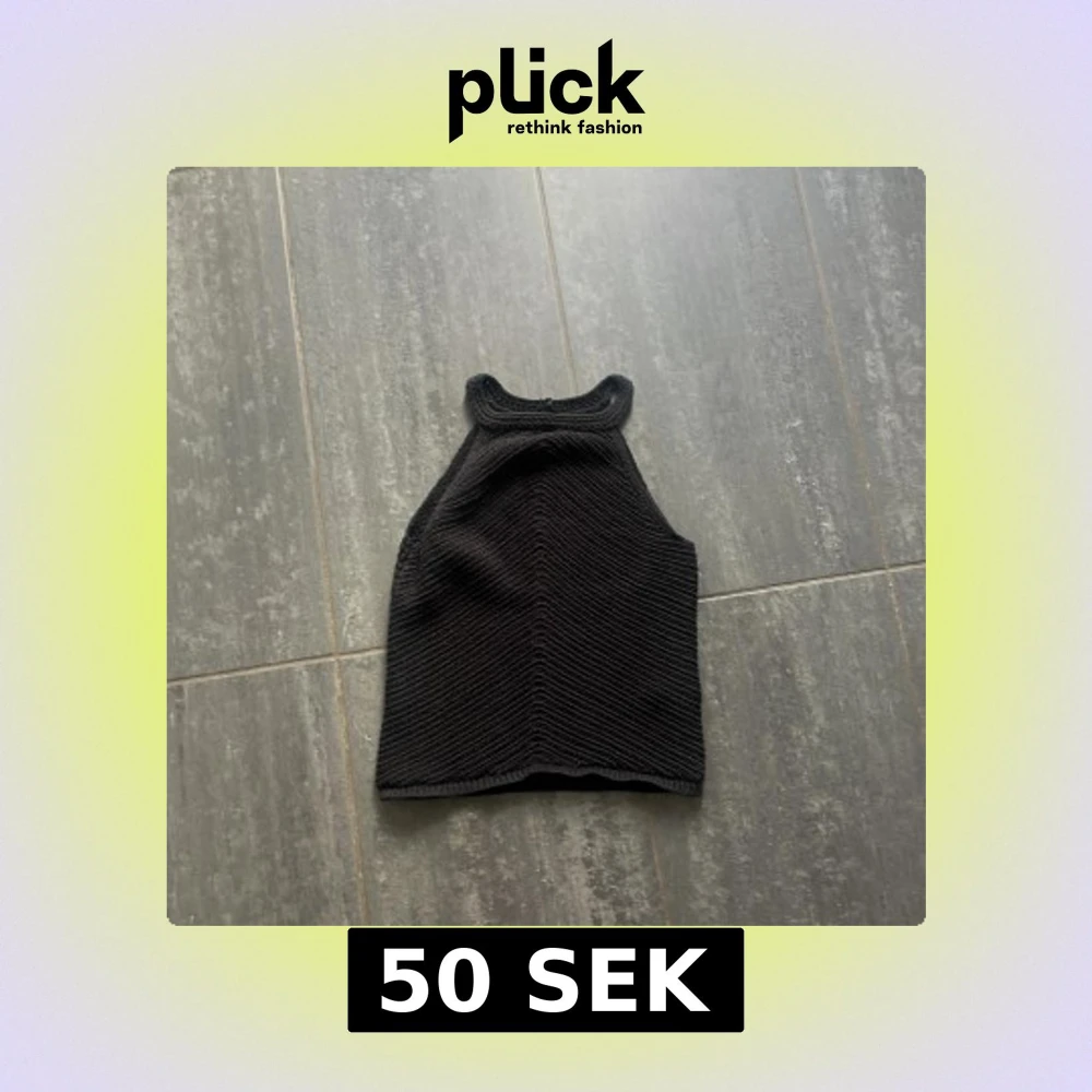 Säljer en svart stickad linnetopp från Lindex i storlek S. Toppen har hög hals med knapp i nacken och är ärmlös. Snyggt virkad struktur med diskret mönster och croppad passform.