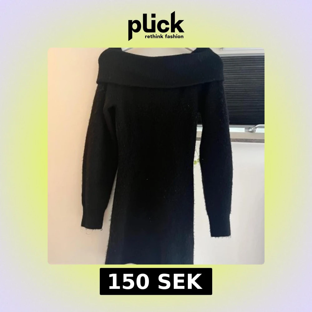Mysig svart stickad klänning från H&M med offshoulder-ringning och långa ärmar. Perfekt för kyligare dagar och enkel att styla med boots eller sneakers. Klänningen har en rak passform och är superbekväm att bära. Inga tecken på användning