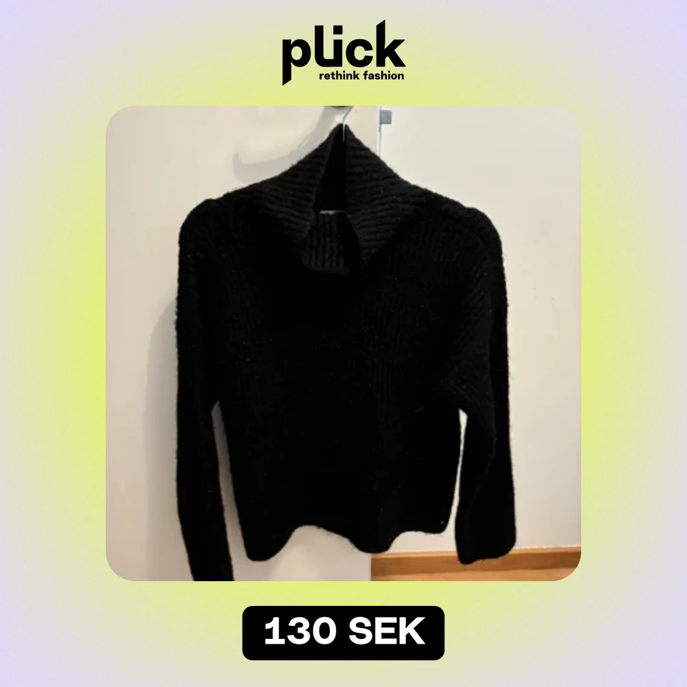 En svart stickad polotröja med långa ärmar. Tröjan har en hög krage och är ribbstickad.