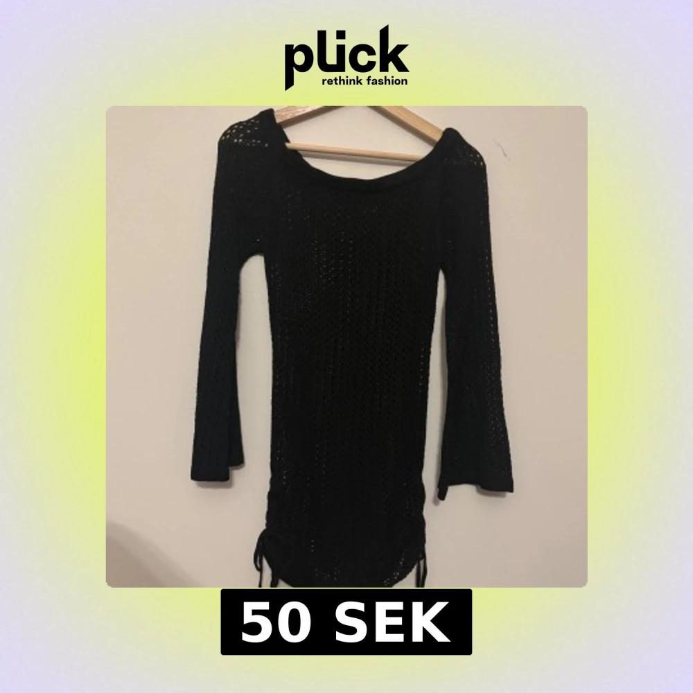 Svart stickad strandklänning med lång utsvängd ärm och snyggt hålmönster. Klänningen har snörning i sidorna nertill för en extra detalj. Perfekt för dig som gillar en enkel men ändå trendig look till stranden.