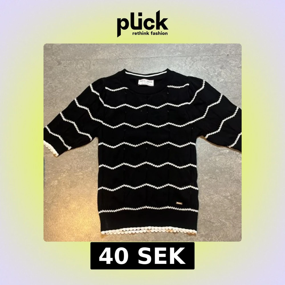 Svart stickad topp från Holly & Whyte med vita sicksack-ränder och dekorativa kanter. Tröjan har rund halsringning och halv-långa ärmar. Perfekt för dig som gillar en klassisk men lekfull stil.