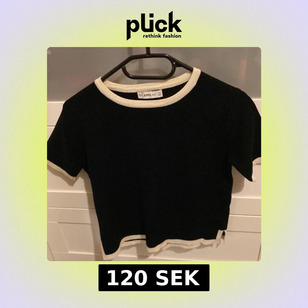 Svart stickad topp från Zara med kontrasterande vita ribbade kanter vid halsringning, ärmslut och nederkant. Modellen är kortärmad och har en klassisk, rund hals. Perfekt för dig som gillar enkel och stilren design.