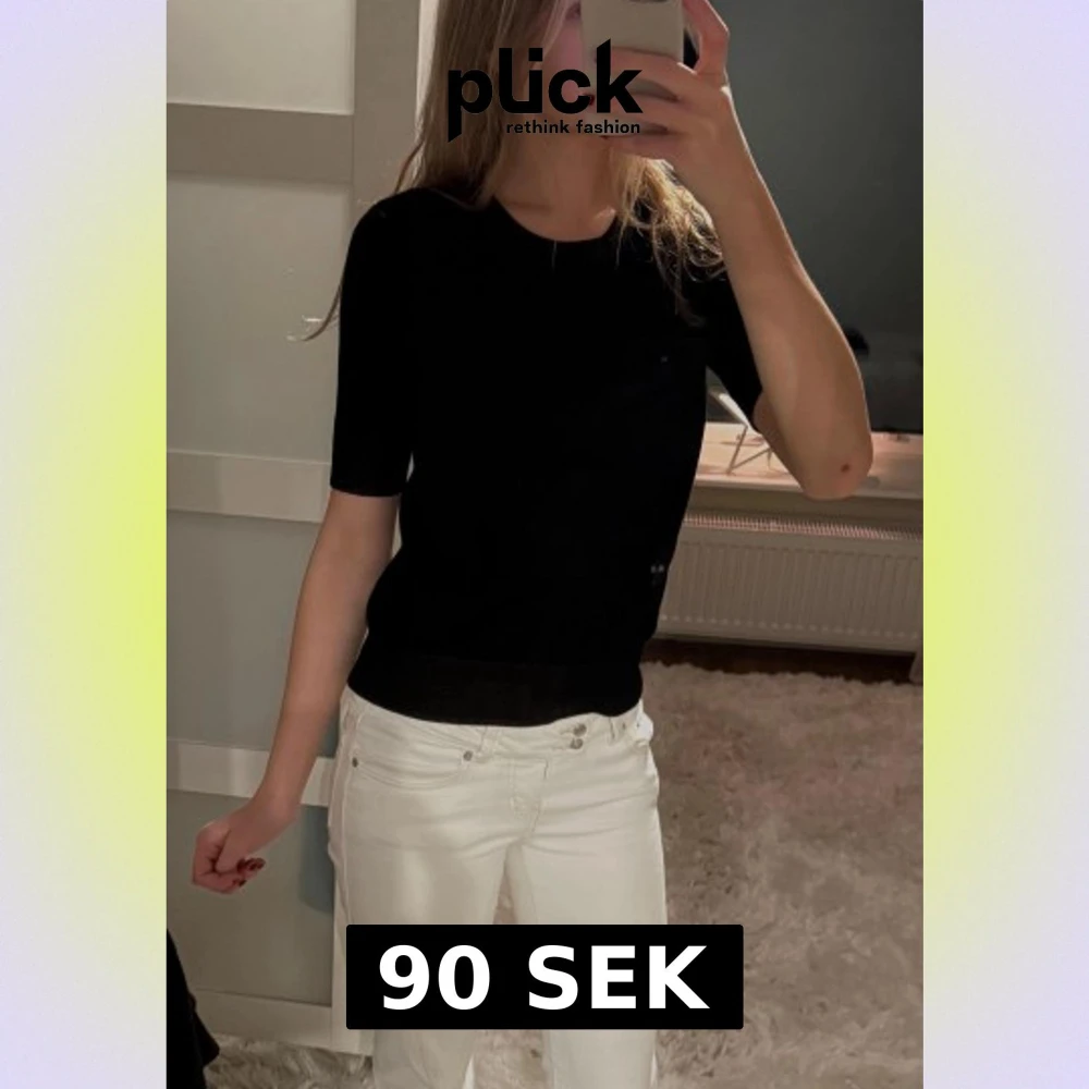 Säljer en svart stickad T-shirt från MQ Stockholm LM. Den var orginellt beige men den blev färgat rosa i tvätten så färgade den helt svart💗