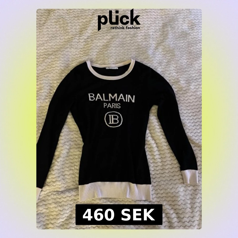 Svart stickad tröja från Balmain Paris med vit logotyp framtill. Tröjan har vita ribbade detaljer vid halsringning, ärmslut och nederkant. Slim passform och långärmad, perfekt för dig som gillar exklusiva märken och stilren design.