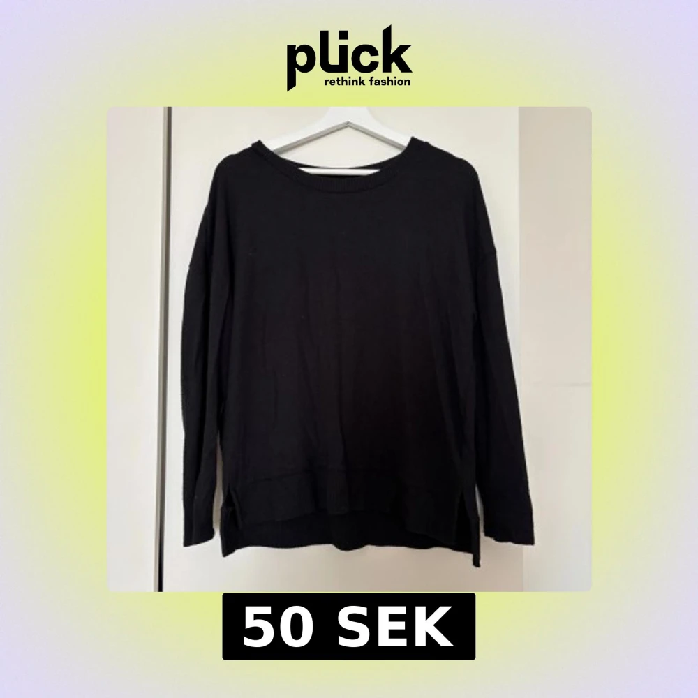 En svart stickad tröja från Hollys i storlek M. Tröjan har rund halsringning, ribbade muddar och slitsar i sidorna för en chill och avslappnad look. Perfekt att slänga på sig när det är kallt ute.