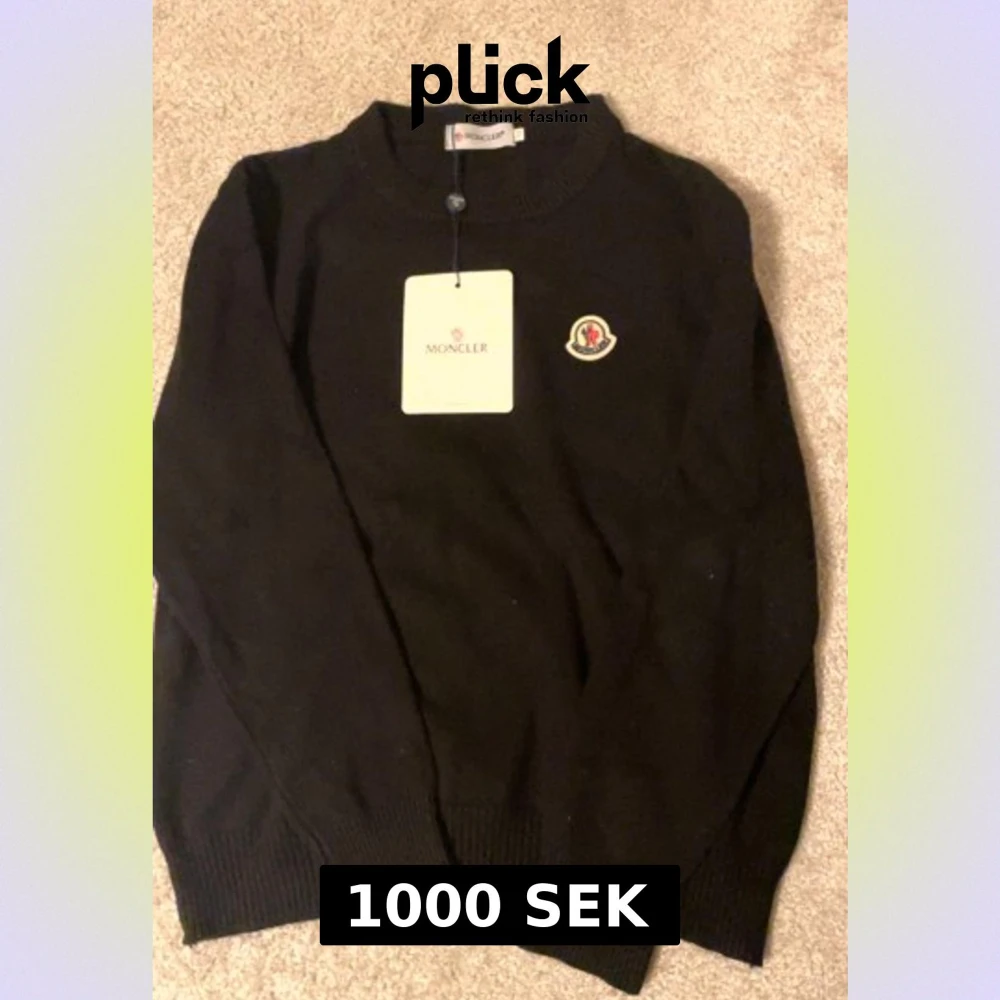 Svart stickad tröja från Moncler med rund hals och ribbade muddar. Klassisk Moncler-logga på bröstet och enkel, stilren design. Perfekt för dig som gillar exklusiva märken och vill ha en snygg, tidlös look.