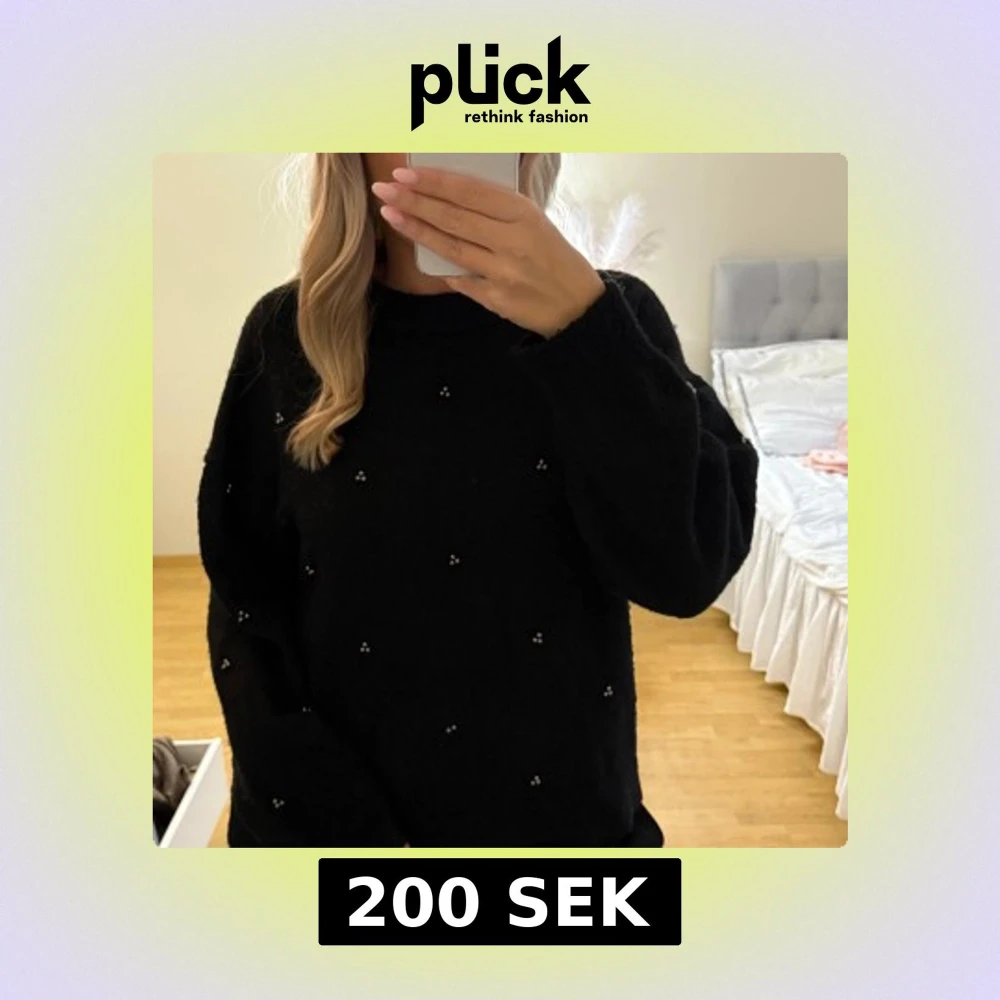 Svart stickad tröja från H&M i storlek M. Tröjan har rund halsringning, lång ärm och är dekorerad med små silver/svart-färgade pärlor över hela plagget. Den har tappat en pärla längst ner och det är verkligen inget man tänker på 💞💞