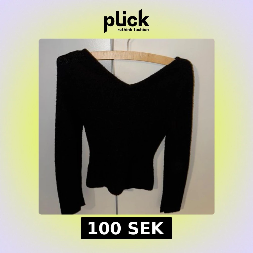 Säljer en svart tunnstickad tröja med v-ringad hals och lång ärm. Tröjan har en figurnära passform och är tillverkad i ett mjukt, lite fluffigt material. Perfekt för dig som gillar en enkel men snygg look.