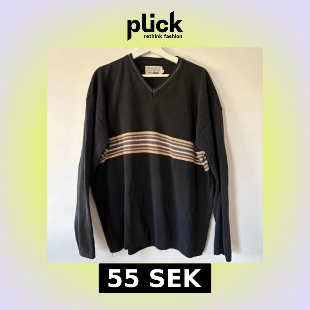 Svart stickad tröja från Creem Comp med v-ringad hals och beigea horisontella ränder över bröstet och ryggen. Tröjan har långa ärmar och ribbade muddar vid halsen. Perfekt för dig som gillar enkel men snygg stil.