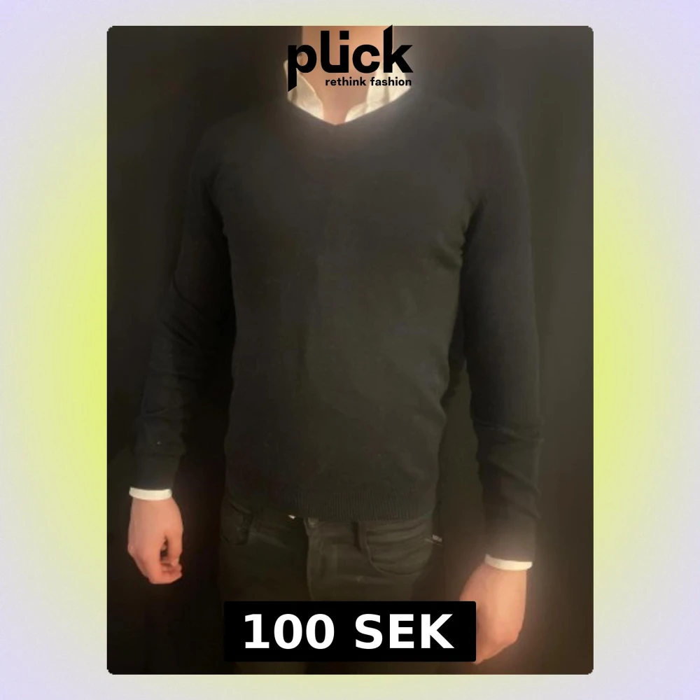Svart v-ringad stickad tröja med lång ärm och ribbade muddar vid ärmslut och nederkant. Enkel och stilren design som funkar till skjorta under. Passformen är normal och materialet känns mjukt och skönt mot huden.