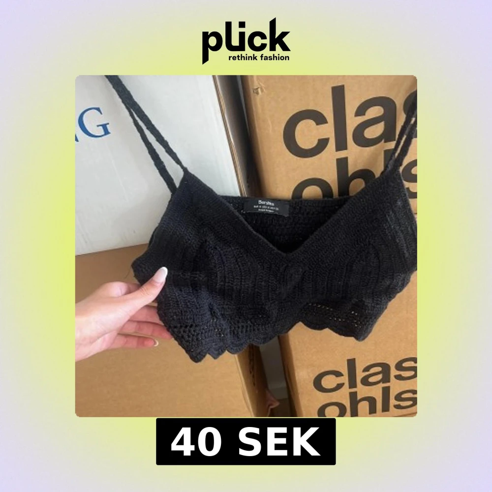 Svart virkad croppad topp från Bershka med smala axelband och vågig kant nertill. Toppen är ärmlös och har en luftig stickad känsla, perfekt för varma dagar. Enkel och stilren design som passar till många olika looks. Så fin att ha på en bikini topp nu i sommar.