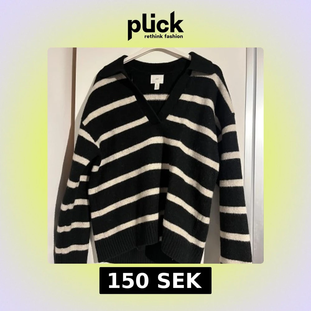 Säljer en stickad randig tröja från H&M. Tröjan har v-ringning och krage, samt långa ärmar. Storlek xs men lite oversize