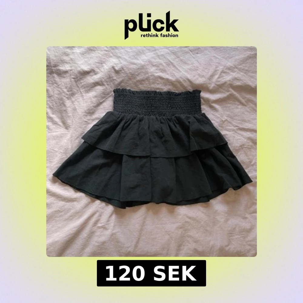 Supersöt svart kortkjol med dubbla volanger. Kjolen har en luftig och flowy känsla, perfekt för att styla med crop tops eller stickade tröjor nu i sommar. Enkel att dra på tack vare resåren i midjan och går att vika ner och göra ännu mer Low waist💞💞 Är stretchig så passar både Xs-S-M