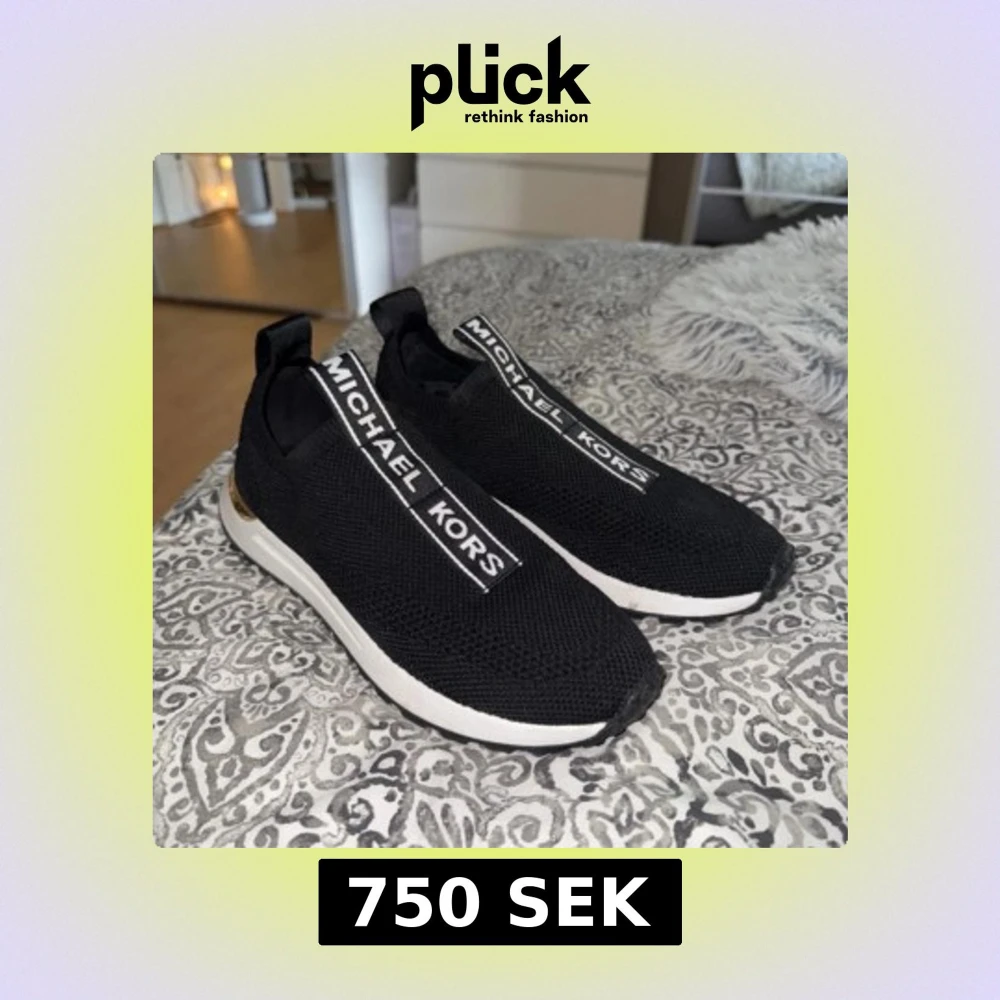 Svarta slip-on sneakers från Michael Kors med vit sula och gulddetaljer vid hälen. Skorna har stickad ovandel i syntetmaterial och tydlig logga på ovansidan. Perfekta för dig som gillar en sportig och trendig look.