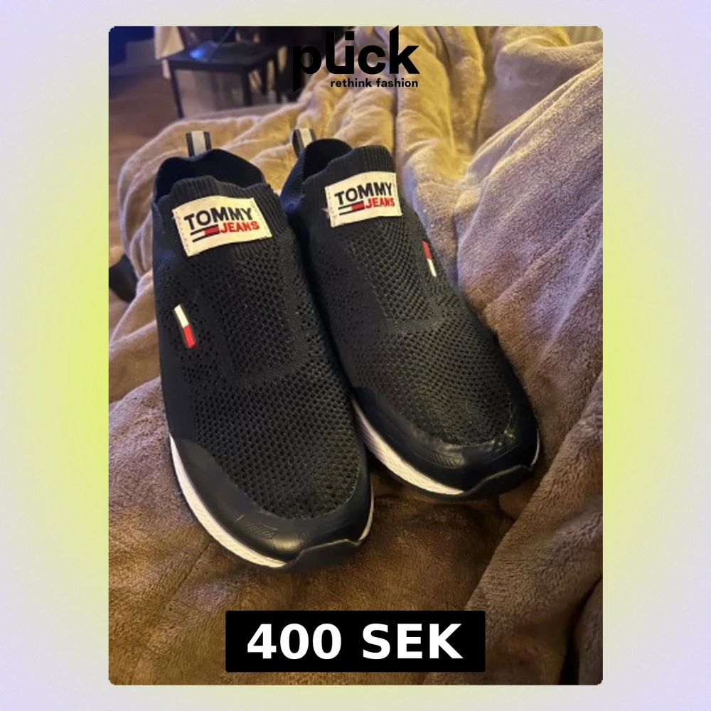 Säljer ett par svart/blå slip-on sneakers från Tommy Jeans i storlek 41. Skorna har stickad ovandel i syntetmaterial, vit och svart sula samt tydliga logodetaljer på plös och sula. Sportig och modern look med elastisk passform och diskreta rödvita detaljer.