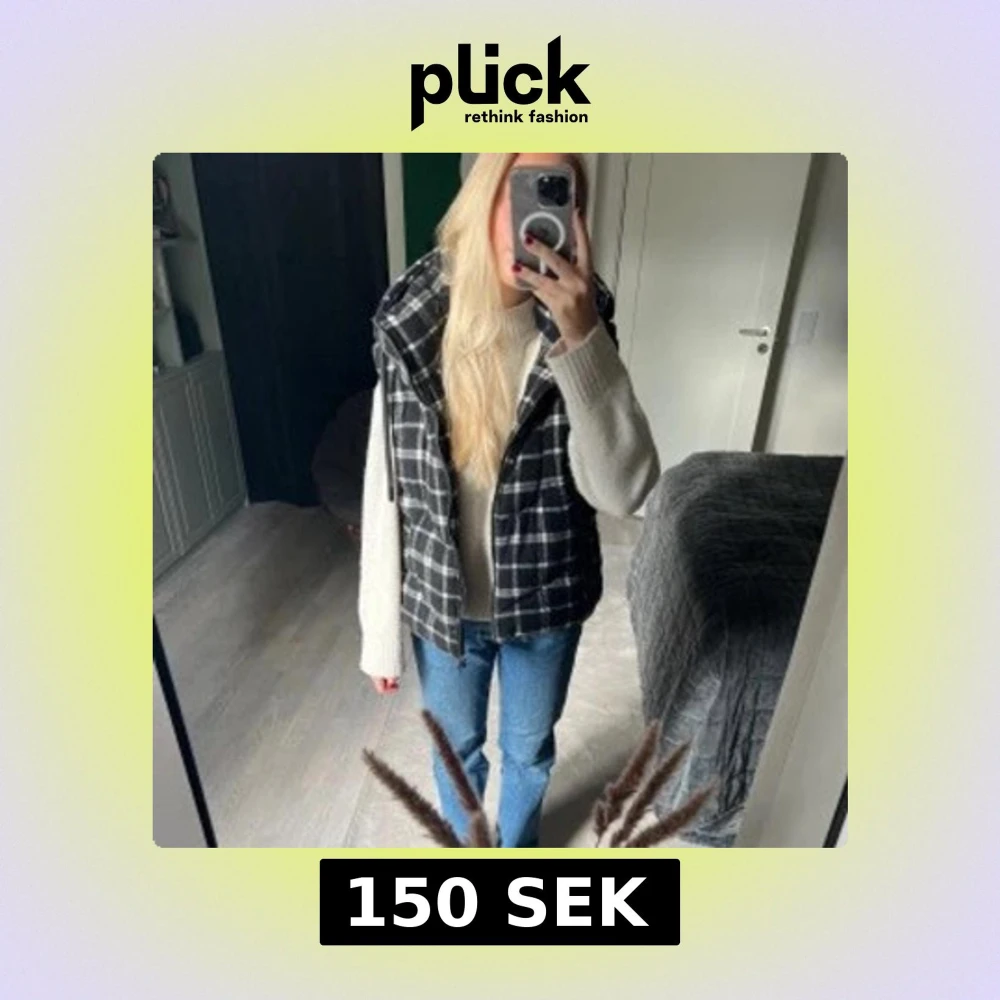 Säljer en svartvit dunväst med rutigt mönster och stor, mysig huva. Västen har dragkedja framtill och snörning vid huvan. Perfekt att slänga över en hoodie eller stickad tröja för en chill look. Knappt använd 💕