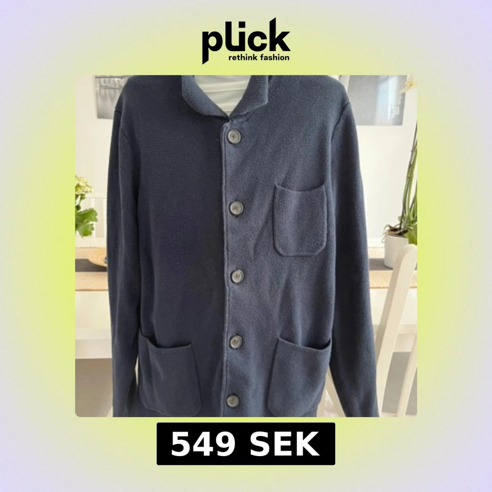 Snygg mörkblå stickad kofta från Timberland i storlek M. Koftan har tre framfickor, knappar med Timberland-logga och ett brunt märke på ärmen. Perfekt för dig som gillar klassisk stil med en chill touch.