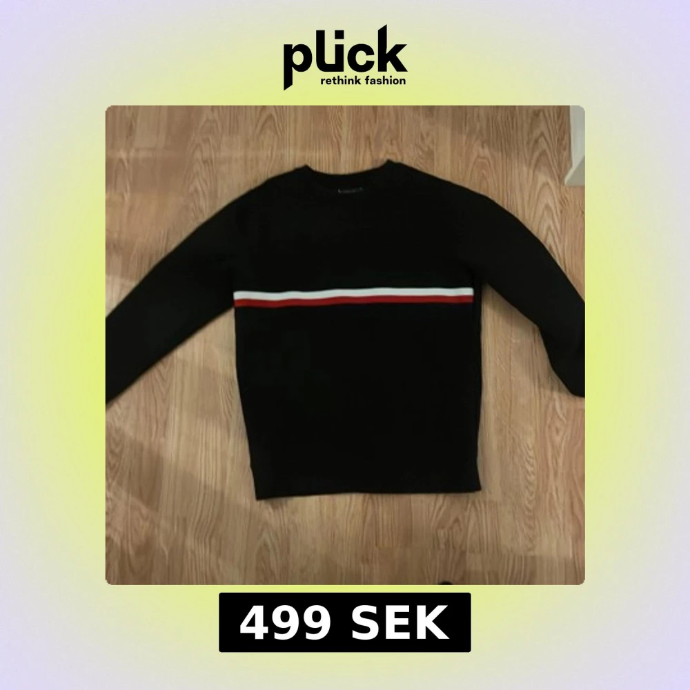 Säljer en svart tröja från Tommy Hilfiger med en horisontell rand i vitt och rött över bröstet. Klassisk rund halsringning och långa ärmar. Perfekt för dig som gillar stilrena plagg med en sportig touch.