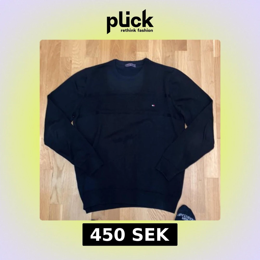 Säljer en svart stickad tröja från Tommy Hilfiger med diskret logga på bröstet. Tröjan har rund halsringning och långa ärmar. Perfekt för en stilren och enkel look. Pris kan diskuteras. Trotts att det står XL passar den som L